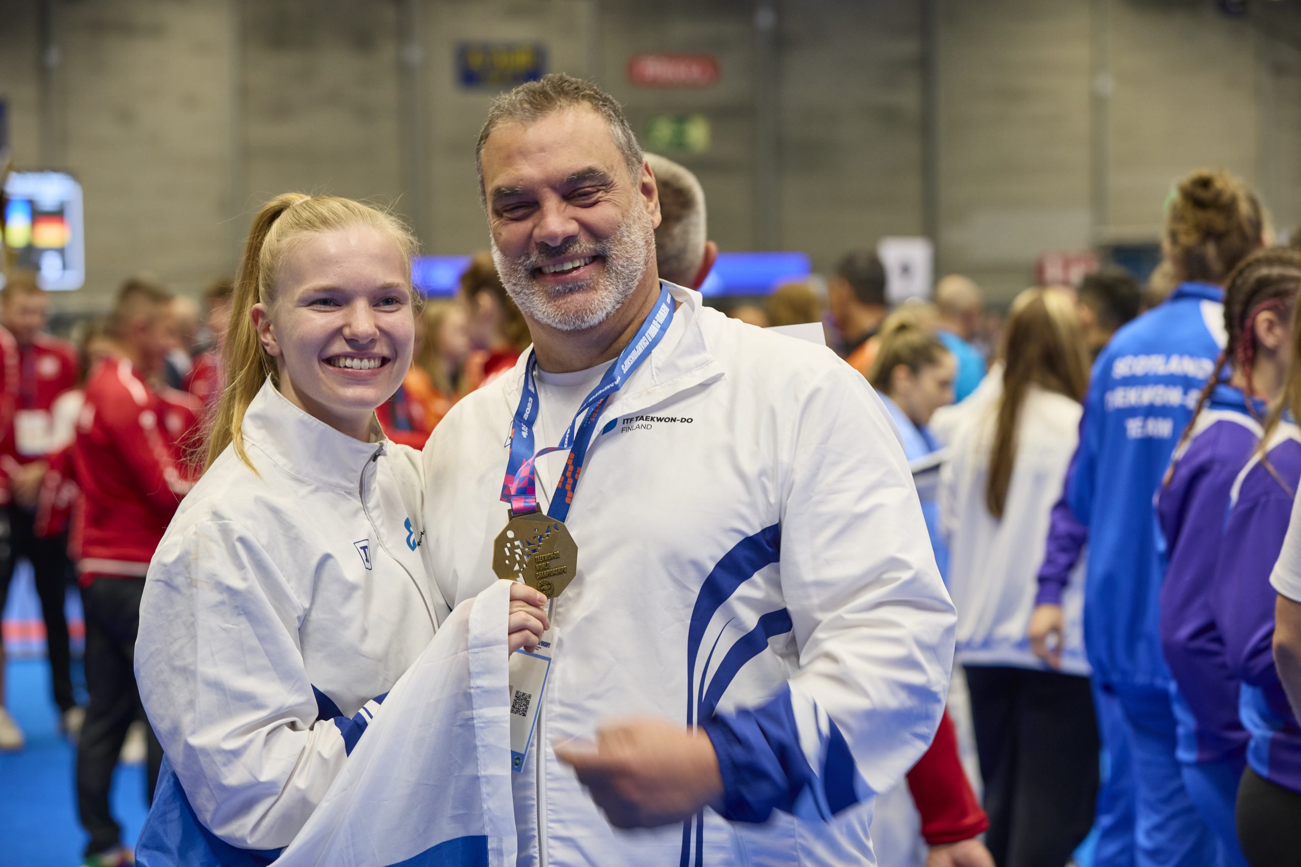 Mestari Meyour vuoden 2023 MM-kilpailuiden iloisissa tunnelmissa oppilaansa Mira Sjövallin (vasemmalla) kanssa. Kuva: Markku Rantanen
