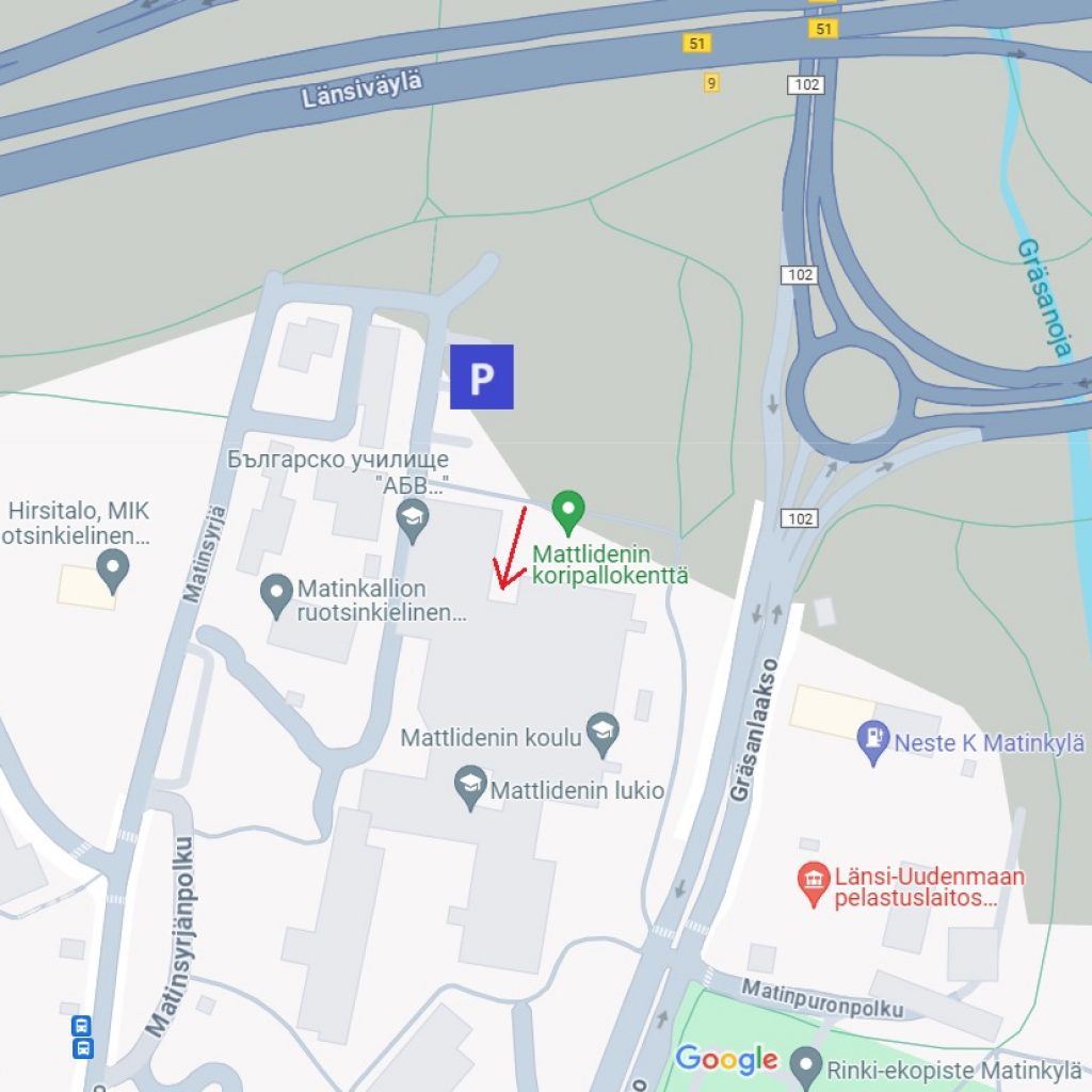 Koulutuspaikkana toimii Mattlidens skola osoitteessa Matinsyrjä 1, 02230 Espoo. Sisäänkäynti tapahtuu E-ovesta (punainen nuoli kartalla).