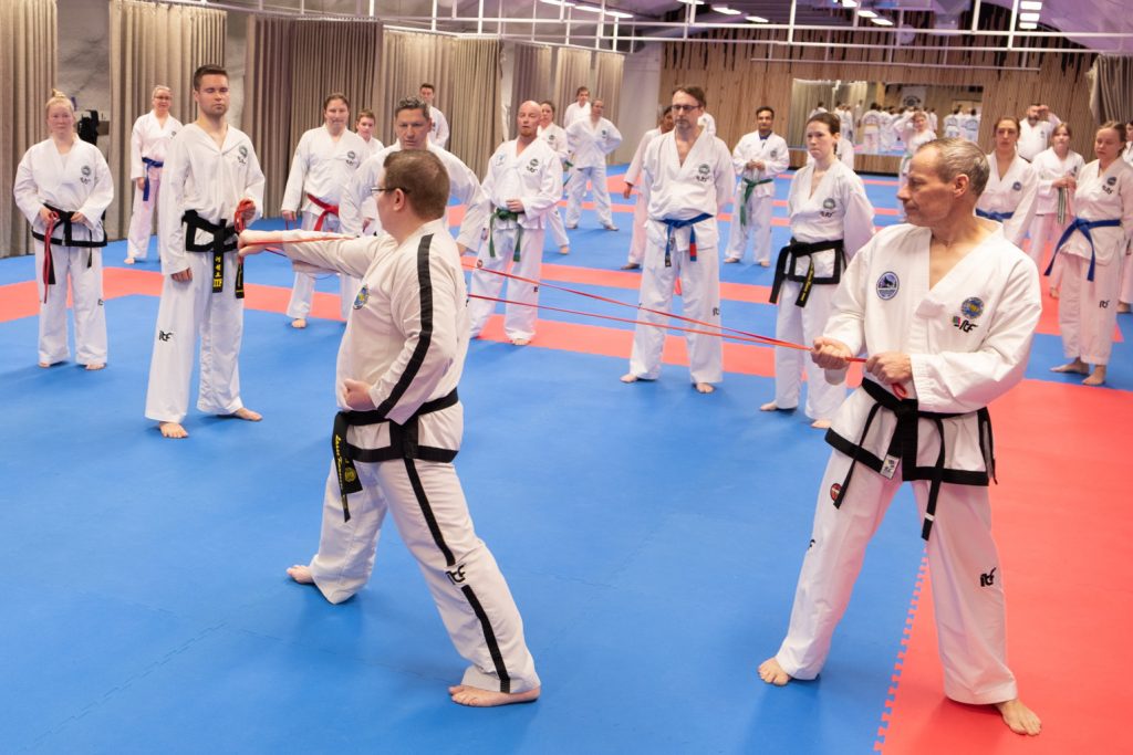 Mm. kuminauhat olivat leirin harjoituksissa kovassa käytössä. Risto Väliahdet Rovaniemeltä (kuvassa oikealla) avustaa sabumnim Lasse Kuusistoa harjoituksen esimerkkisuorituksessa. Kuva: Esa Salminen